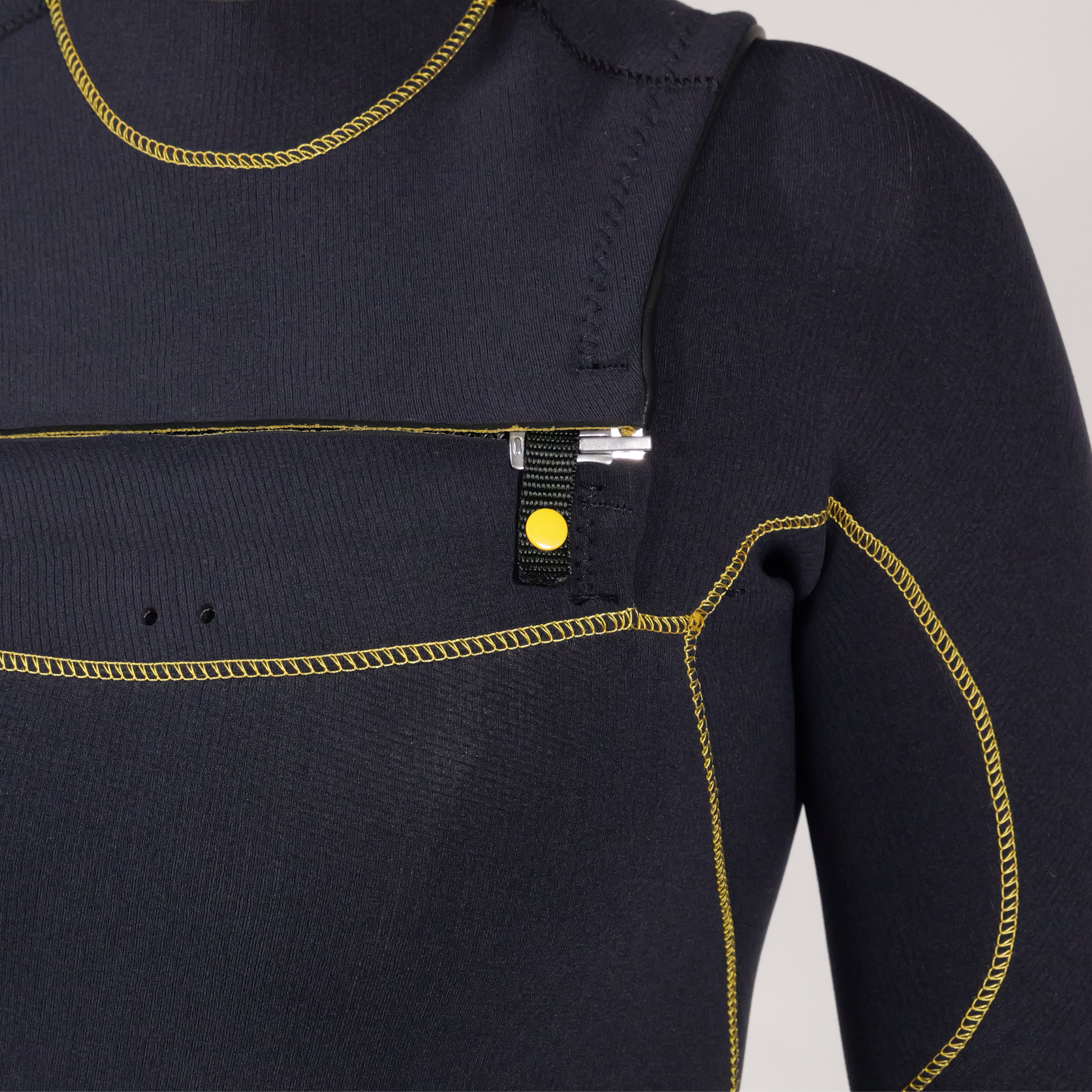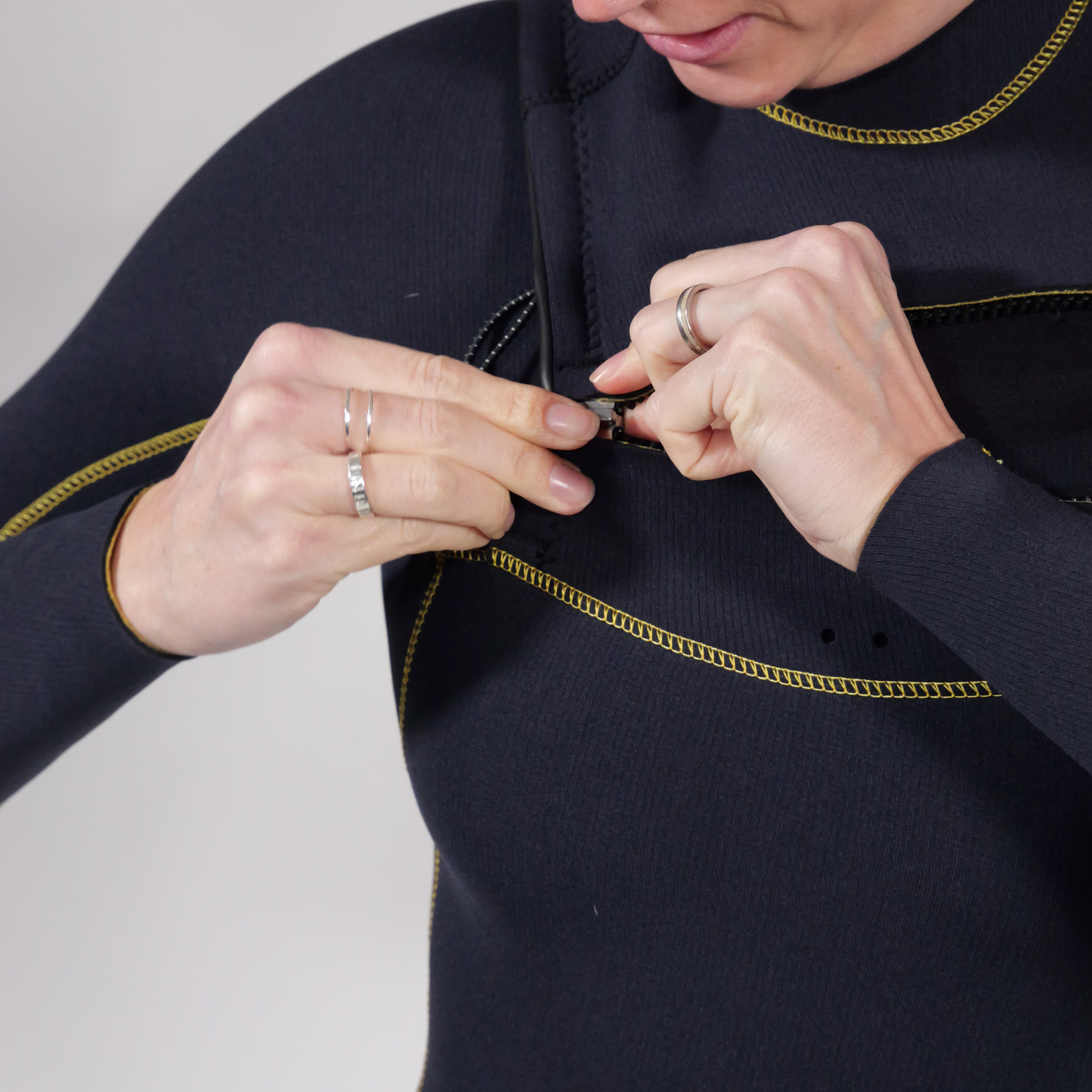 The full-opening chest-zip entry creates a wider entry point for easier on-off and balanced shoulder tension. Its central placement supports even arm rotation and paddling freedom, chosen for the Warm Water Series to maximise flexibility.